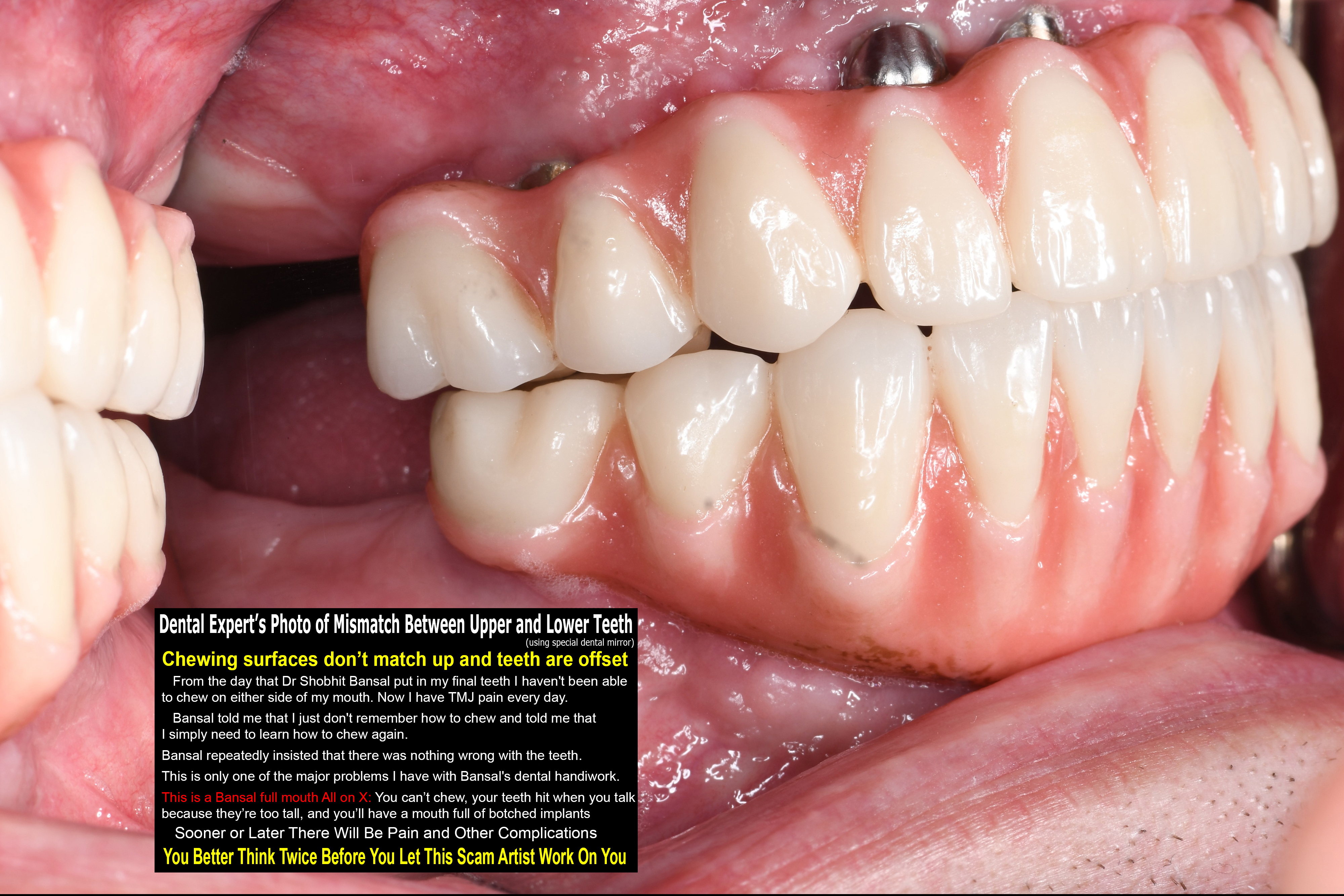 Visit dentalartshuntley.net for all the details of all the problems with Dr Shobhit Bansal's All on X dental implants and zirconia teeth.